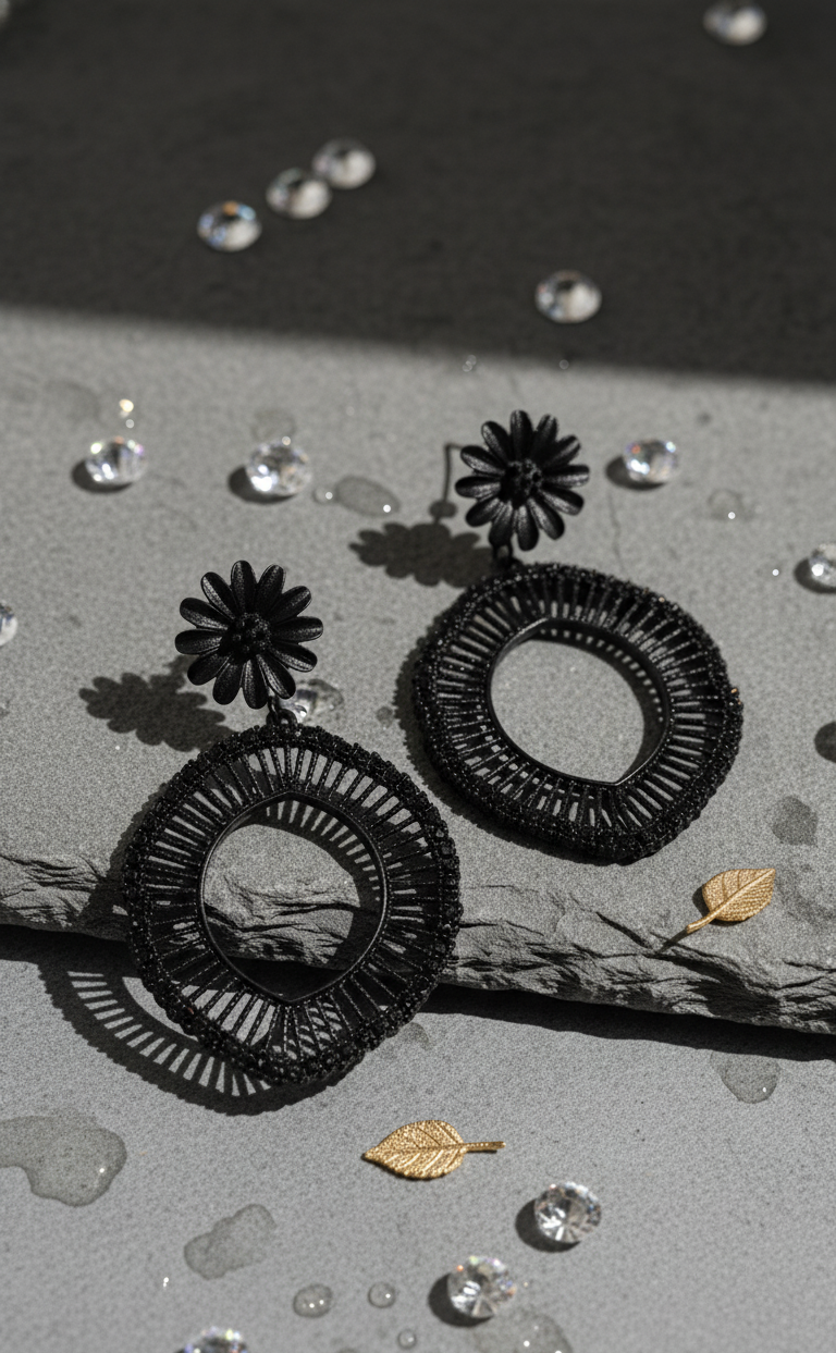 These unique Black Drop Earrings feature a textured, lightweight design that blends natural and modern elements. The earrings dangle from a delicate black flower stud post and showcase a large, round, open-hoop shape with an intricate woven or cage-like structure. They offer a bohemian chic style with a sophisticated monochromatic twist.