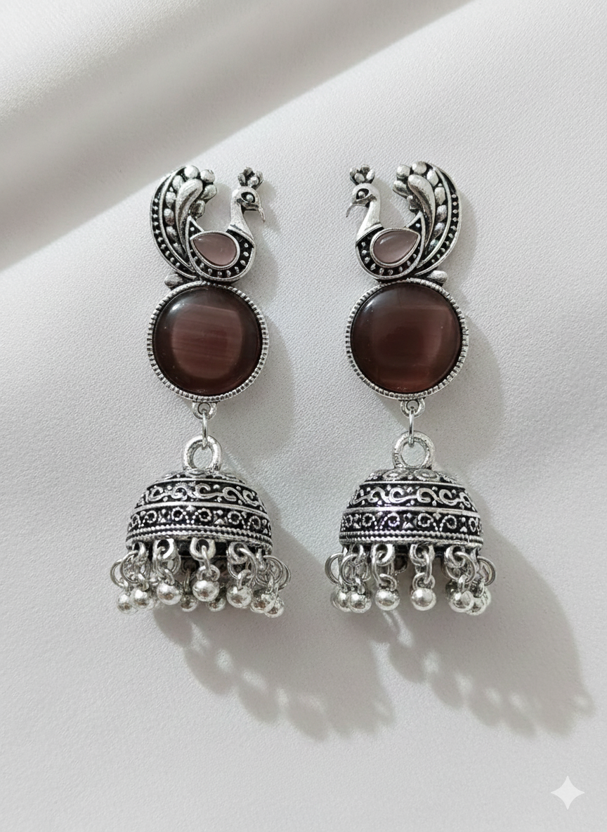 Embrace the regal charm of Indian heritage with these exquisite Peacock Jhumka Earrings. Handcrafted with intricate detailing, each piece features a majestic peacock motif perched atop a glowing, circular Mother-of-Pearl inlay. The traditional Jhumka bell hangs gracefully below, adorned with delicate silver beads that create a soft, rhythmic chime with every movement. Whether paired with ethnic wear or used to add an artisanal touch to a modern outfit, these earrings are a statement of sophisticated grace.