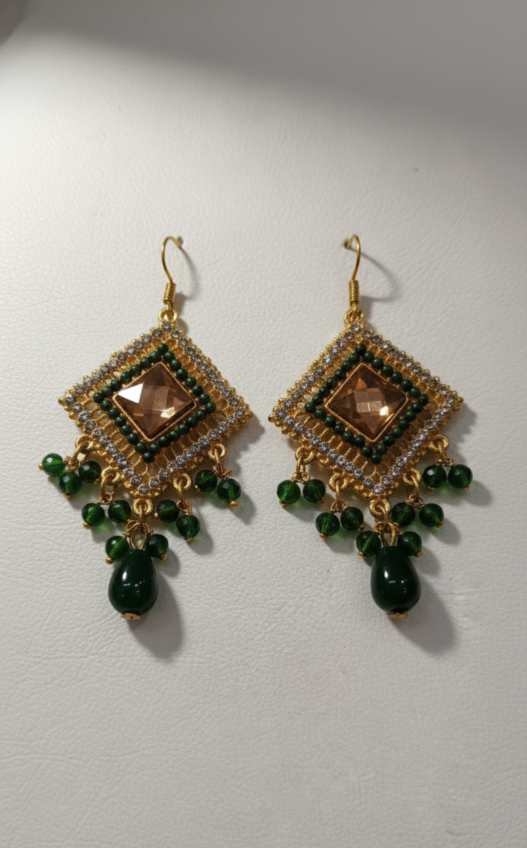 These striking gold-toned jhumka earrings feature a beautiful rhombus (diamond) shape adorned with glittering champagne/brown central stones and a border of vibrant emerald green accents. Delicate hanging green beads complete the festive and traditional look. Perfect for weddings, parties, and cultural events.