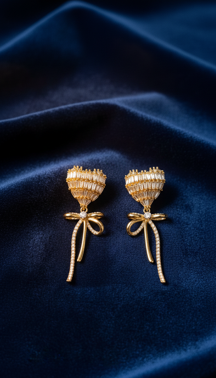 Make a lasting impression with these stunning puffy heart earrings, fully encrusted with baguette-cut cubic zirconia stones for a radiant, high-end sparkle. A delicate ribbon bow accent, finished with micro-pavé stones, adds graceful movement and charm. Crafted from premium steel and luxuriously gold-plated, they combine elegance and durability perfect for weddings, parties, or any special occasion where you want to shine.