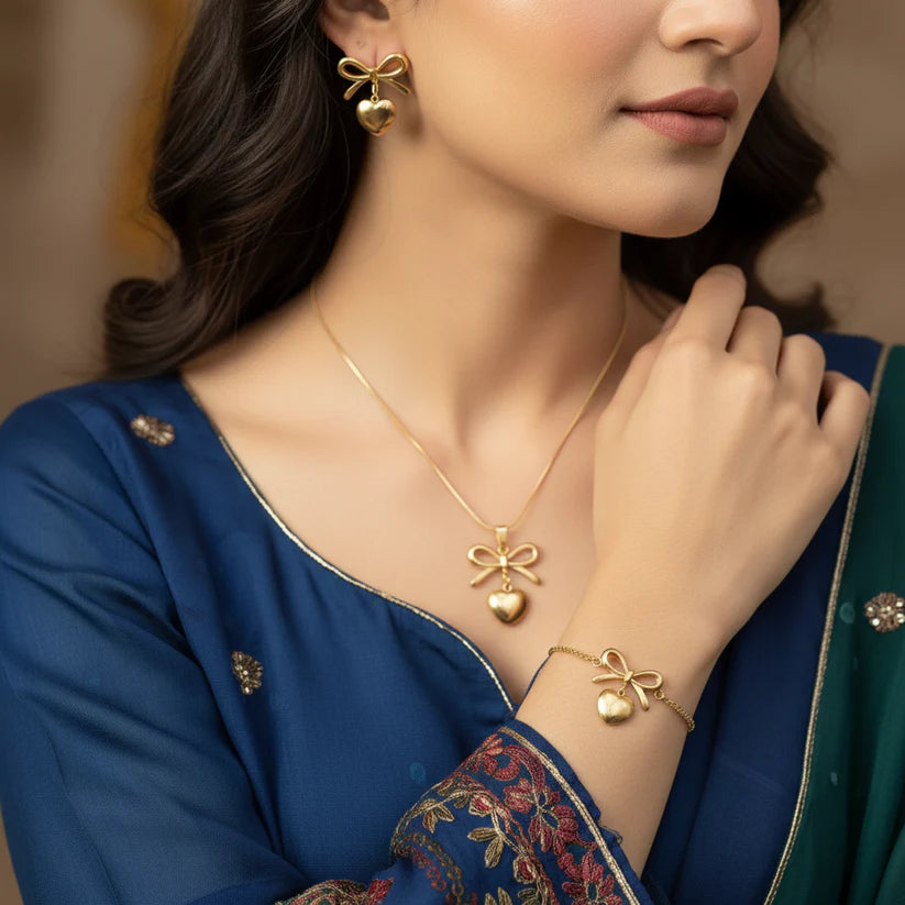 Premium Stainless Steel Gold Bow & Heart Jewelry Set